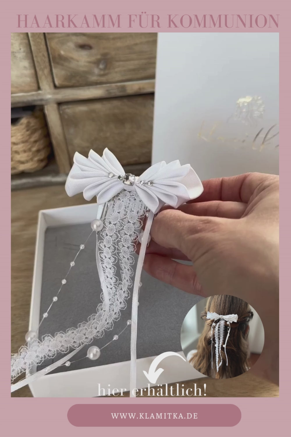 Dieser elegante Haarkamm ist ein handgefertigtes Schmuckstück, das durch seine stilvolle Schleife, die zarten fließenden Bänder und einen funkelnden Strassstein als Highlight bezaubert. Mit seiner liebevollen Verarbeitung verleiht er jeder Kommunionsfrisur einen festlichen Glanz und sorgt für einen stilvollen Auftritt am besonderen Tag. Dank seines leichten Designs ist er einfach anzubringen, bietet sicheren Halt und trägt sich angenehm – perfekt für den langen Festtag.