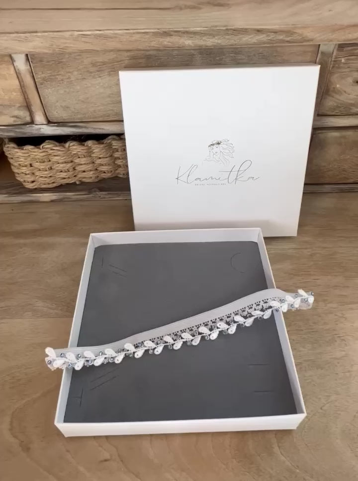Dieses elegante moderne Strumpfband kombiniert feine weiße Spitze mit funkelnden blauen Strasssteinen – ein stilvolles, zeitgemäßes Detail für den Hochzeitstag. Das moderne Strumpfband erfüllt die „Etwas Blaues“-Tradition und eignet sich perfekt für beliebte Bräuche wie das Strumpfband-Werfen. Ein dezentes Accessoire, das Romantik, Eleganz und modernen Chic vereint.